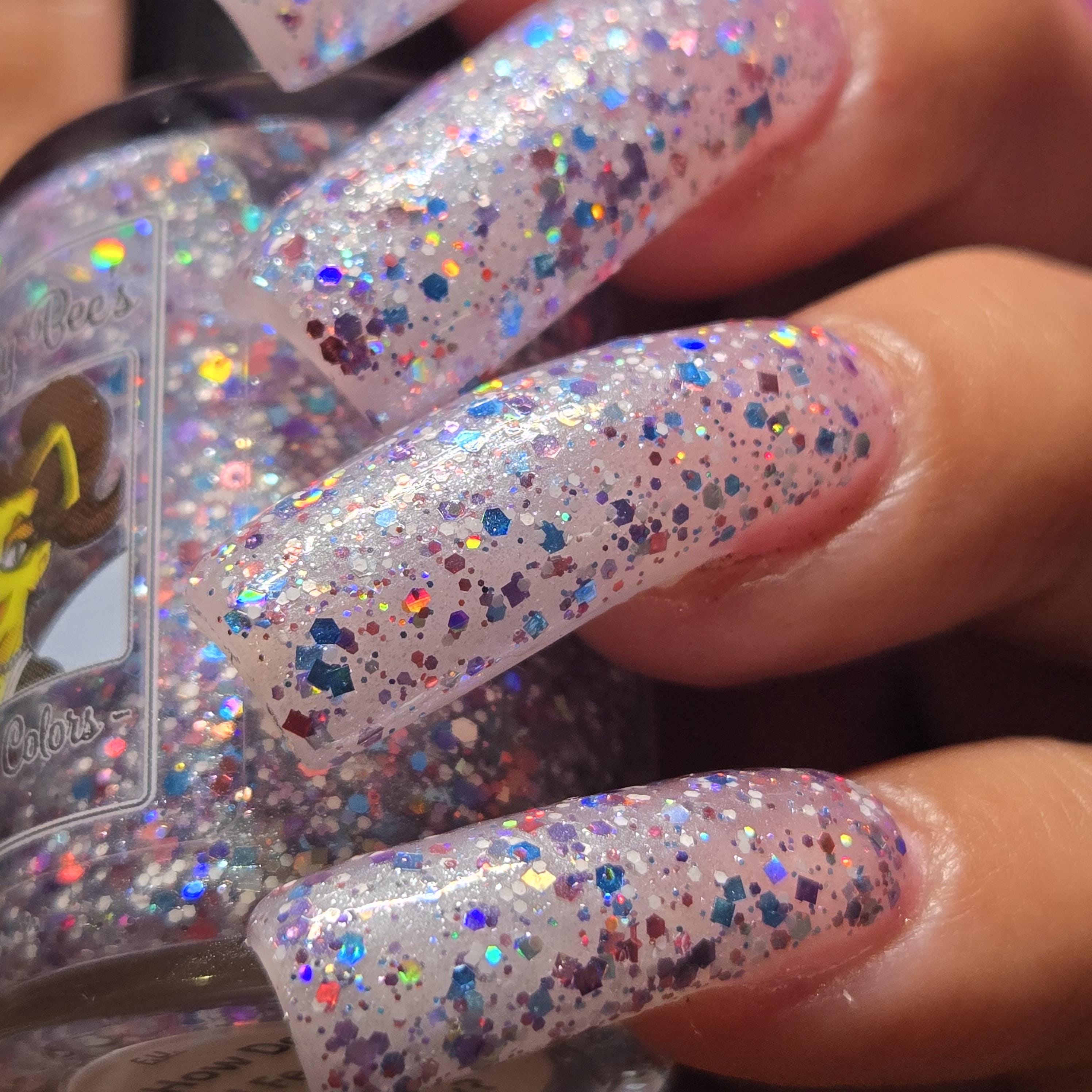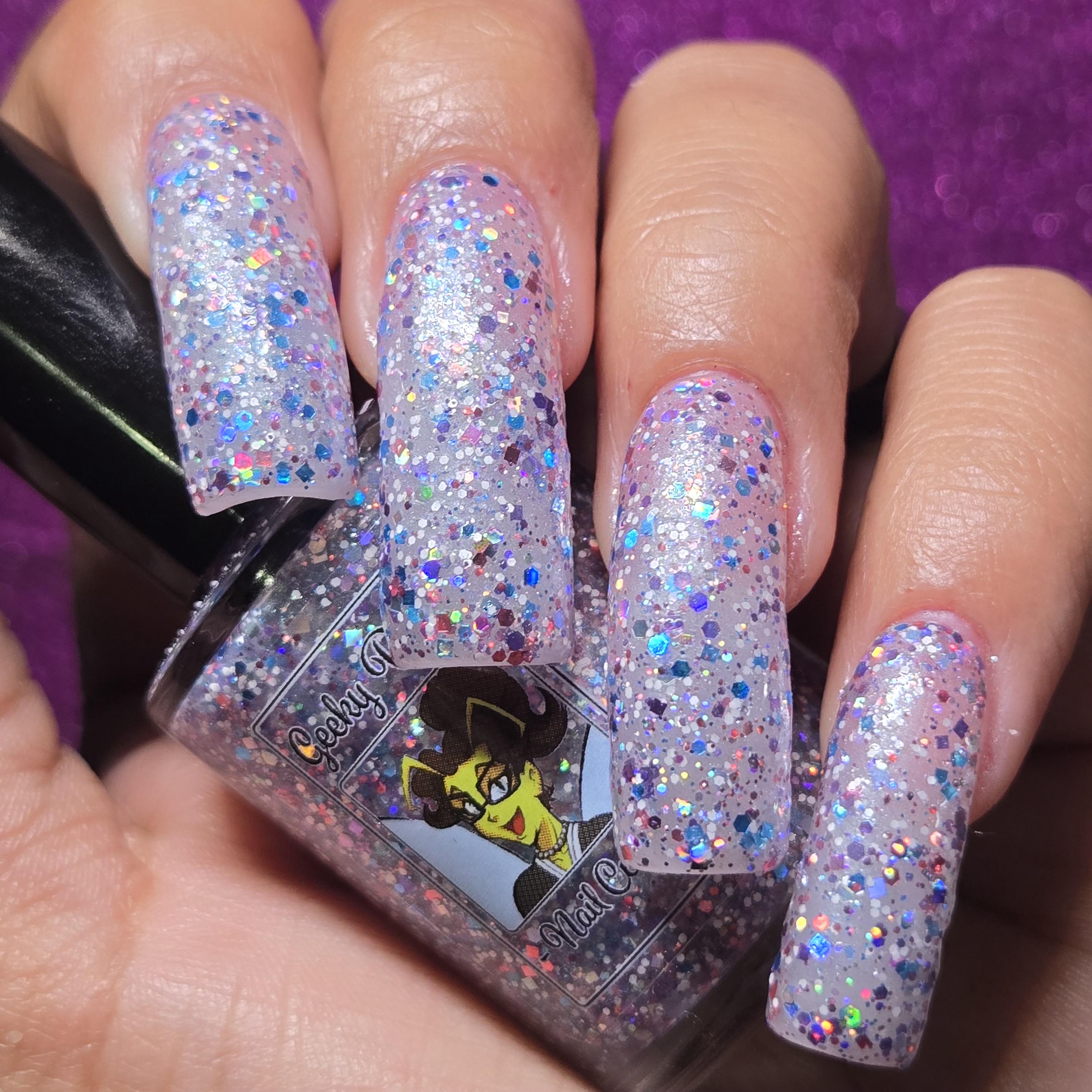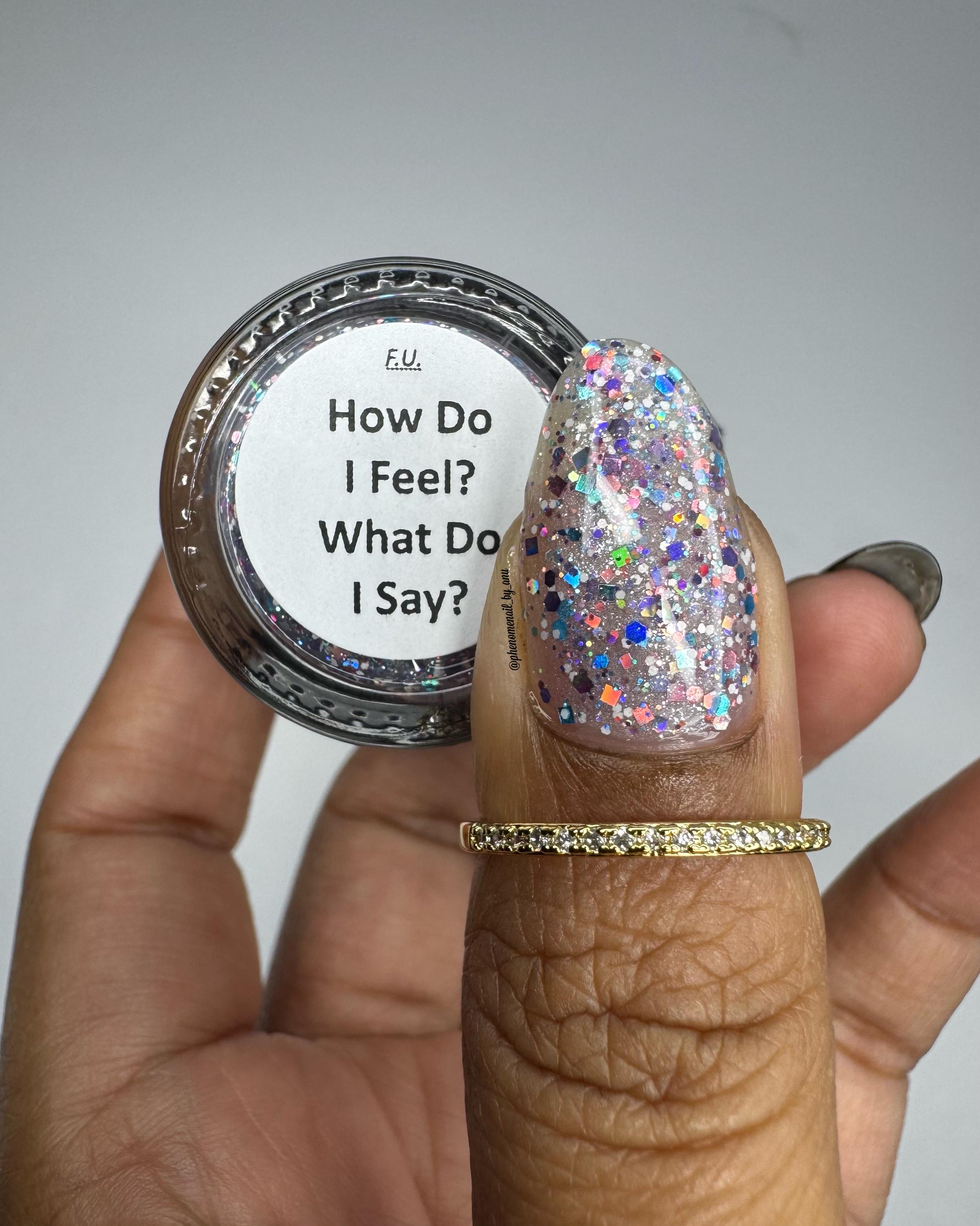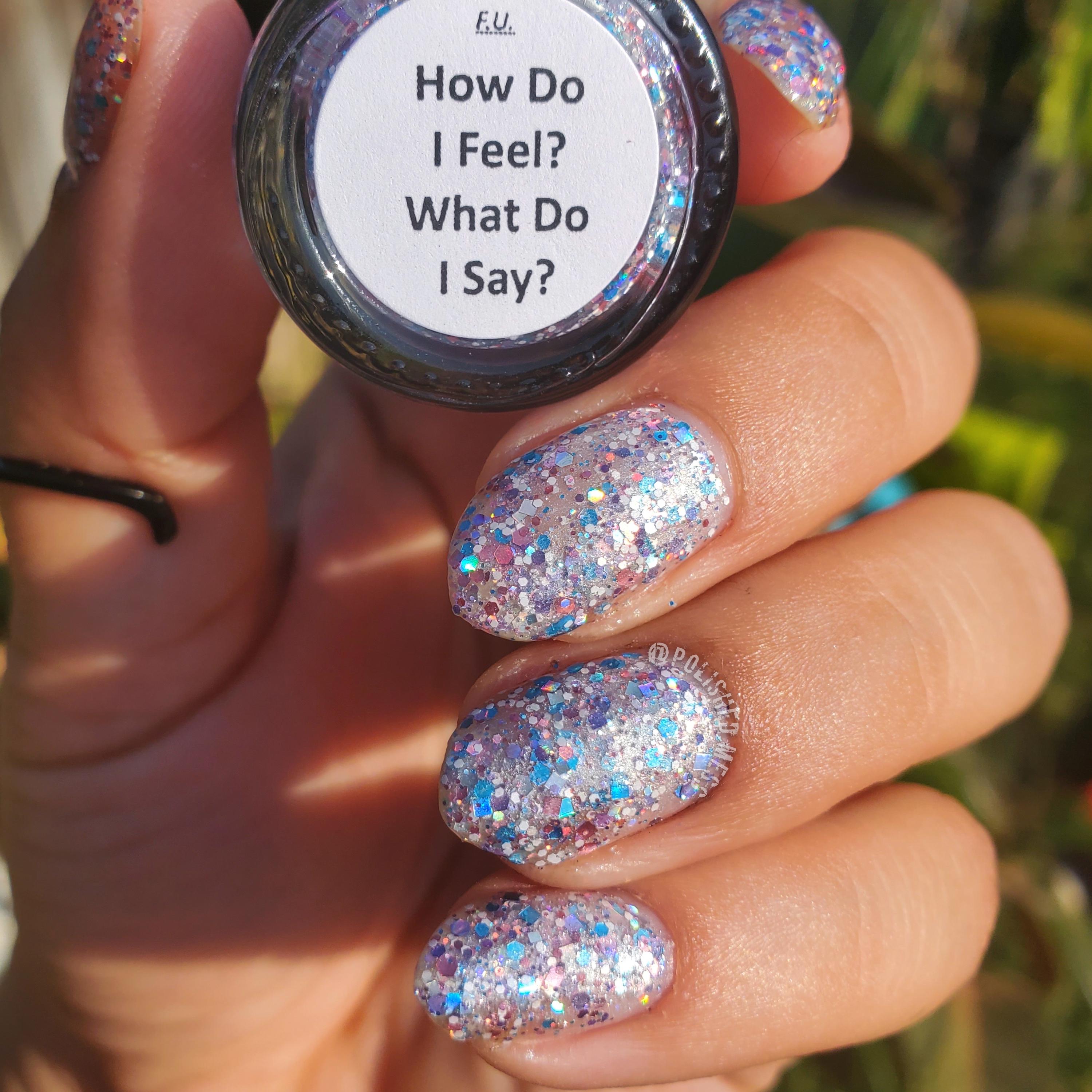 “How Do I Feel? What Do I Say?” is a sheer silver shimmer base jam packed with a sugary mixture of matte white, and silver, blue, pink, and purple holo glitters.