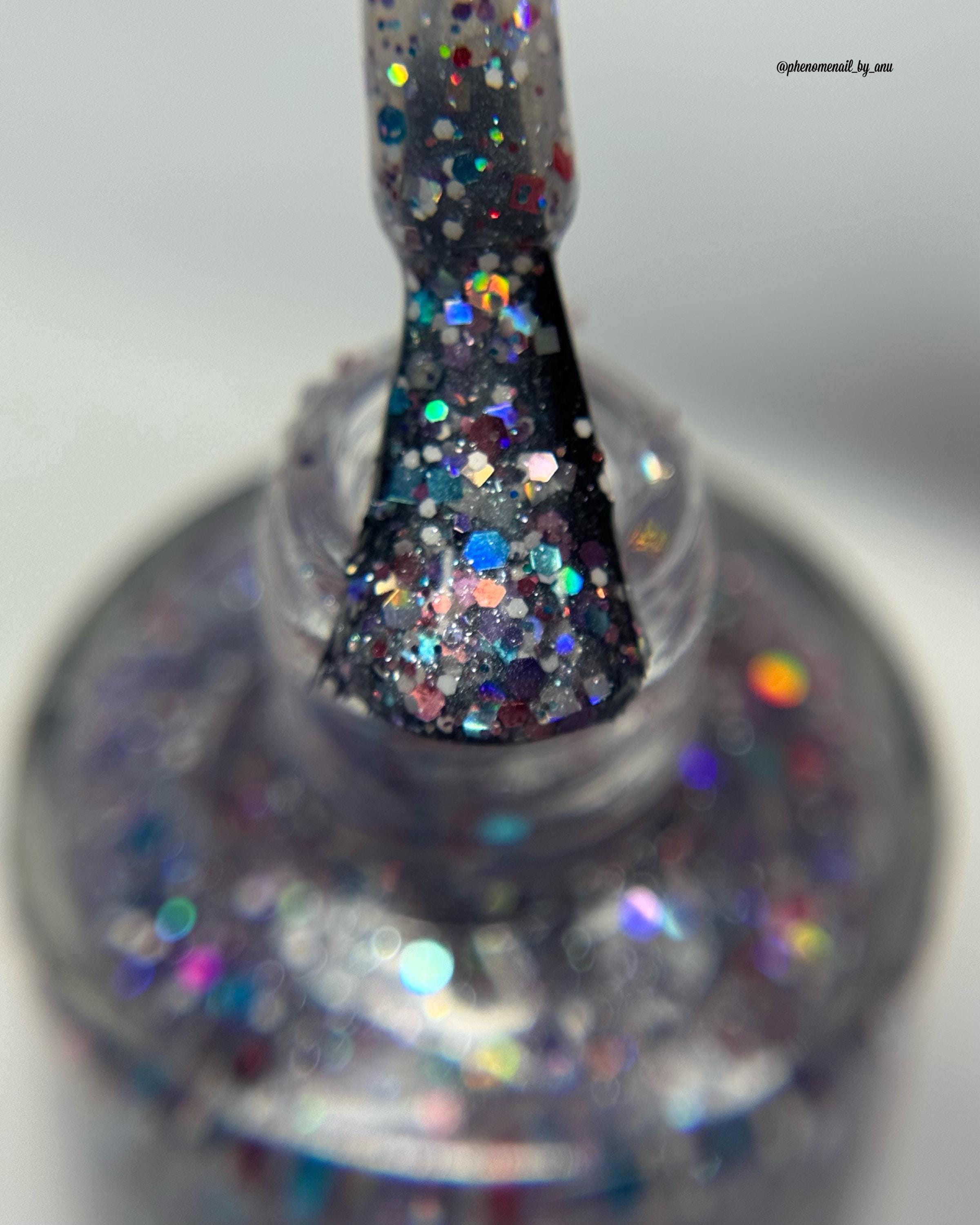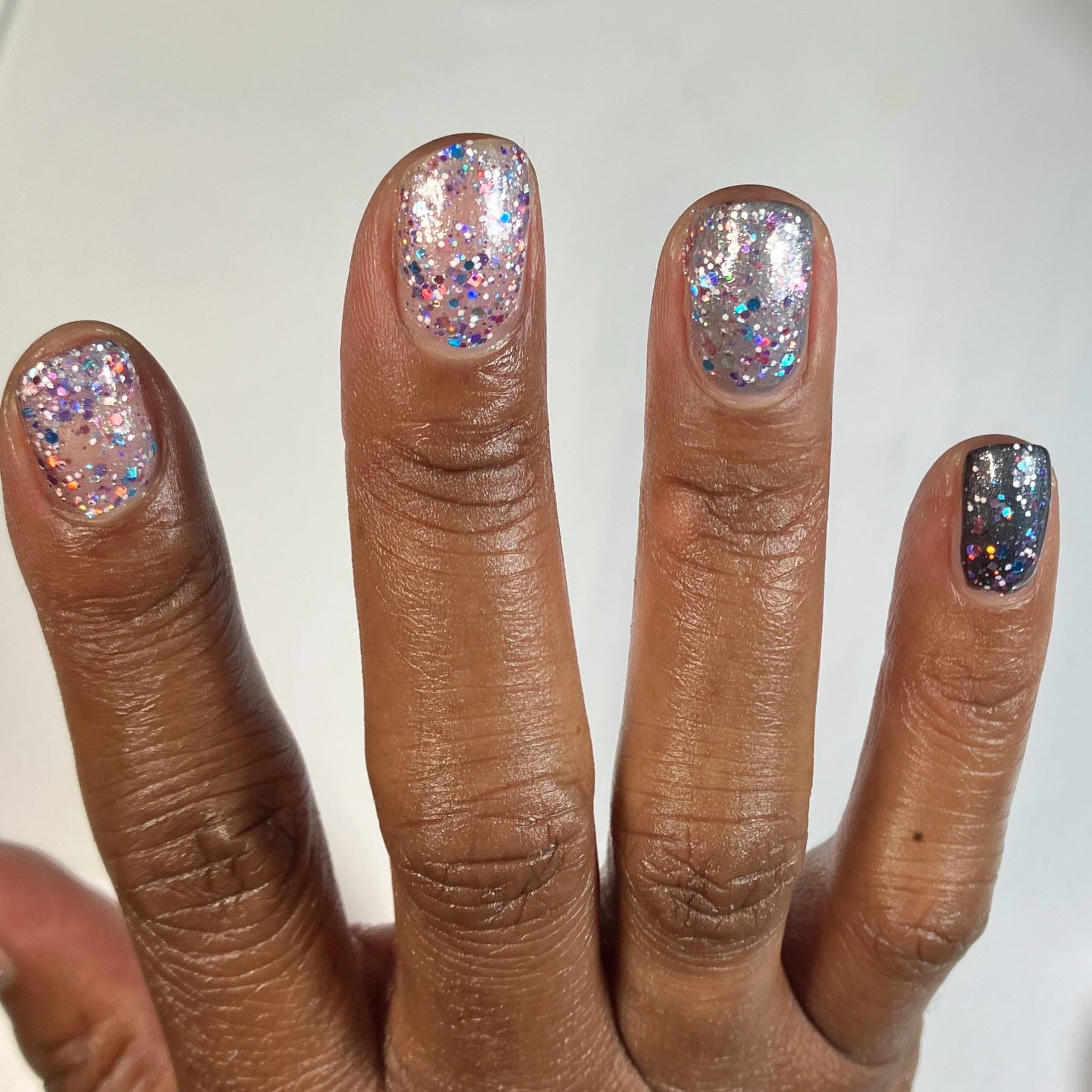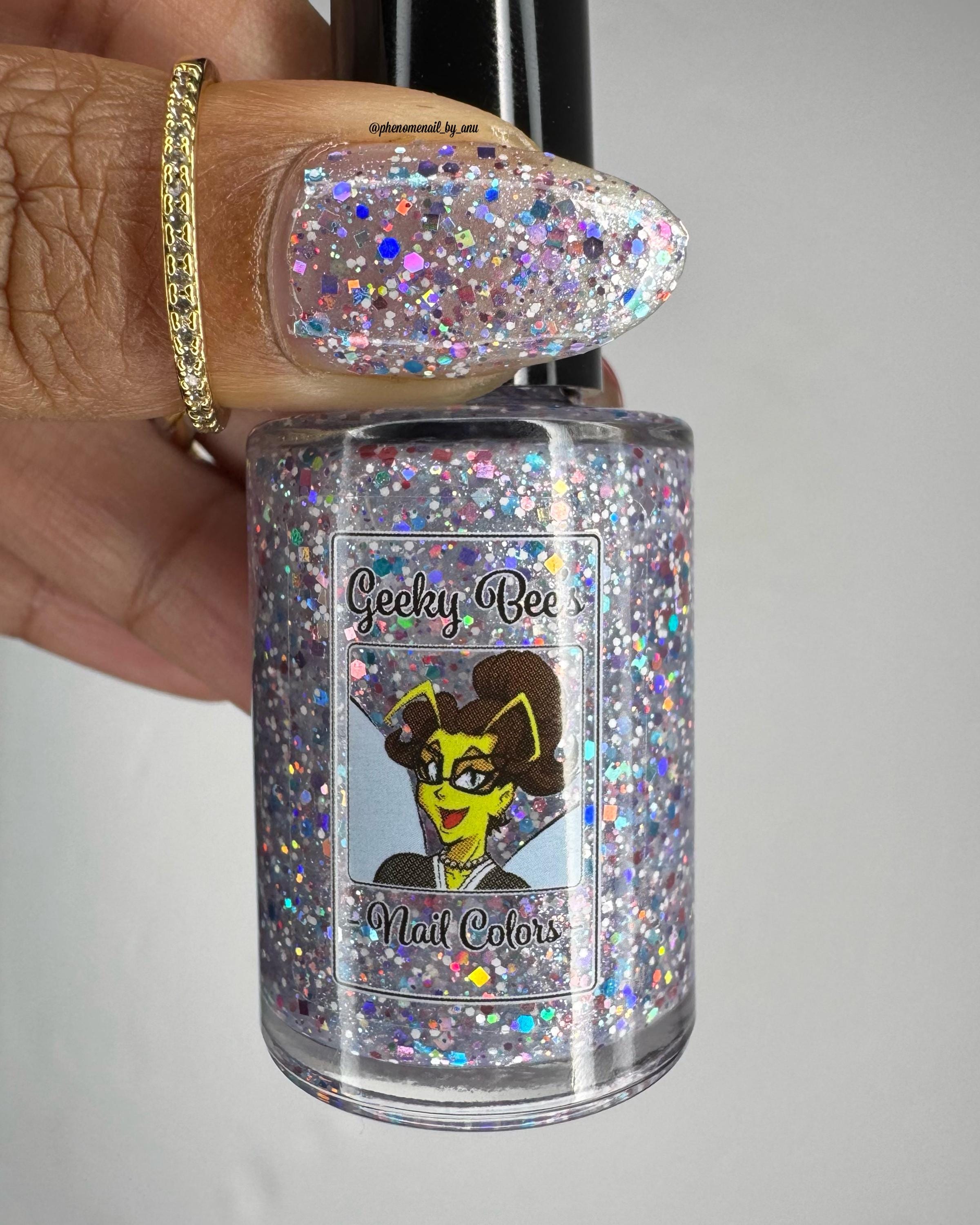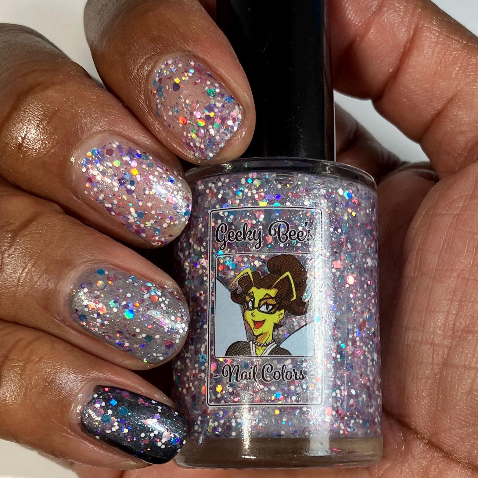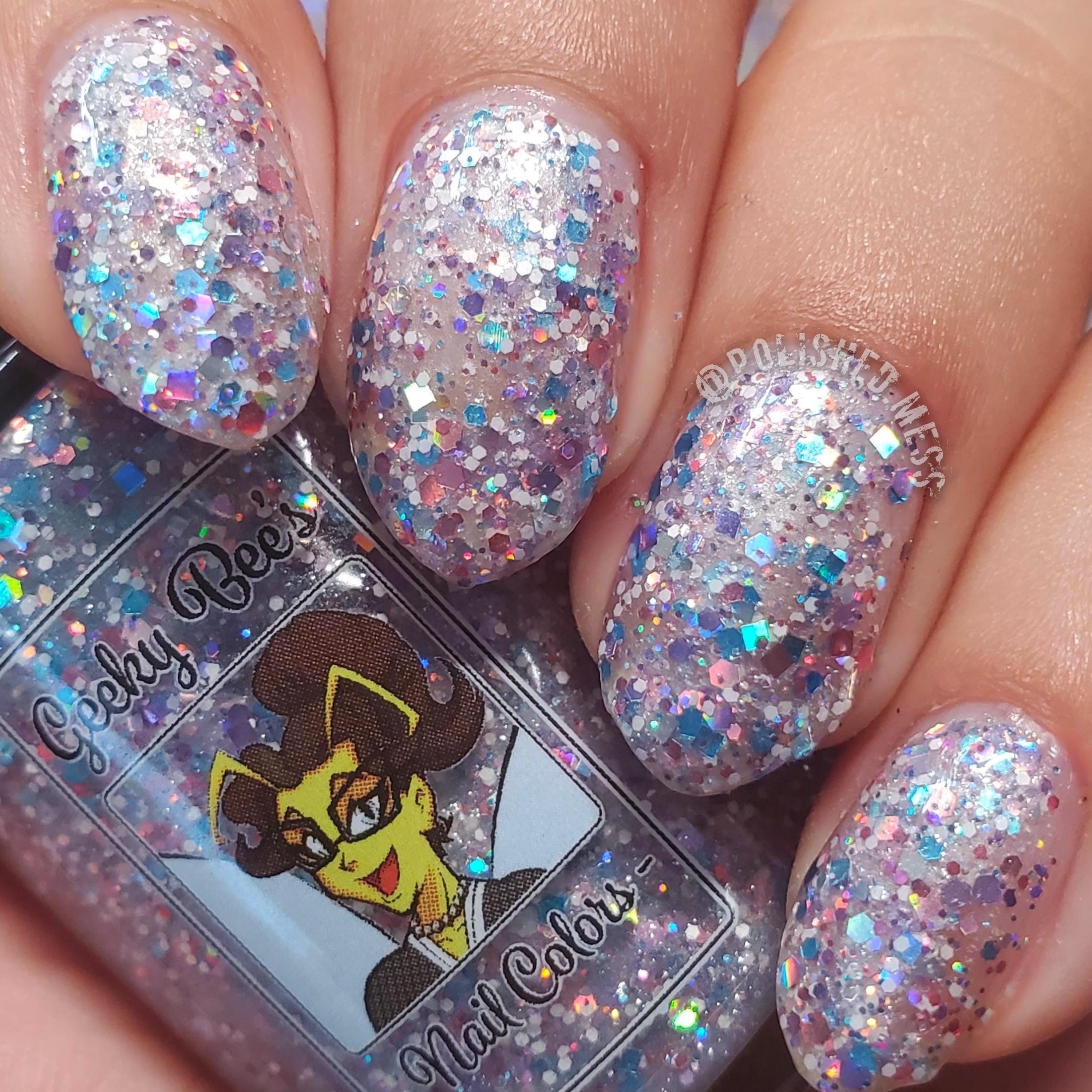 “How Do I Feel? What Do I Say?” is a sheer silver shimmer base jam packed with a sugary mixture of matte white, and silver, blue, pink, and purple holo glitters.