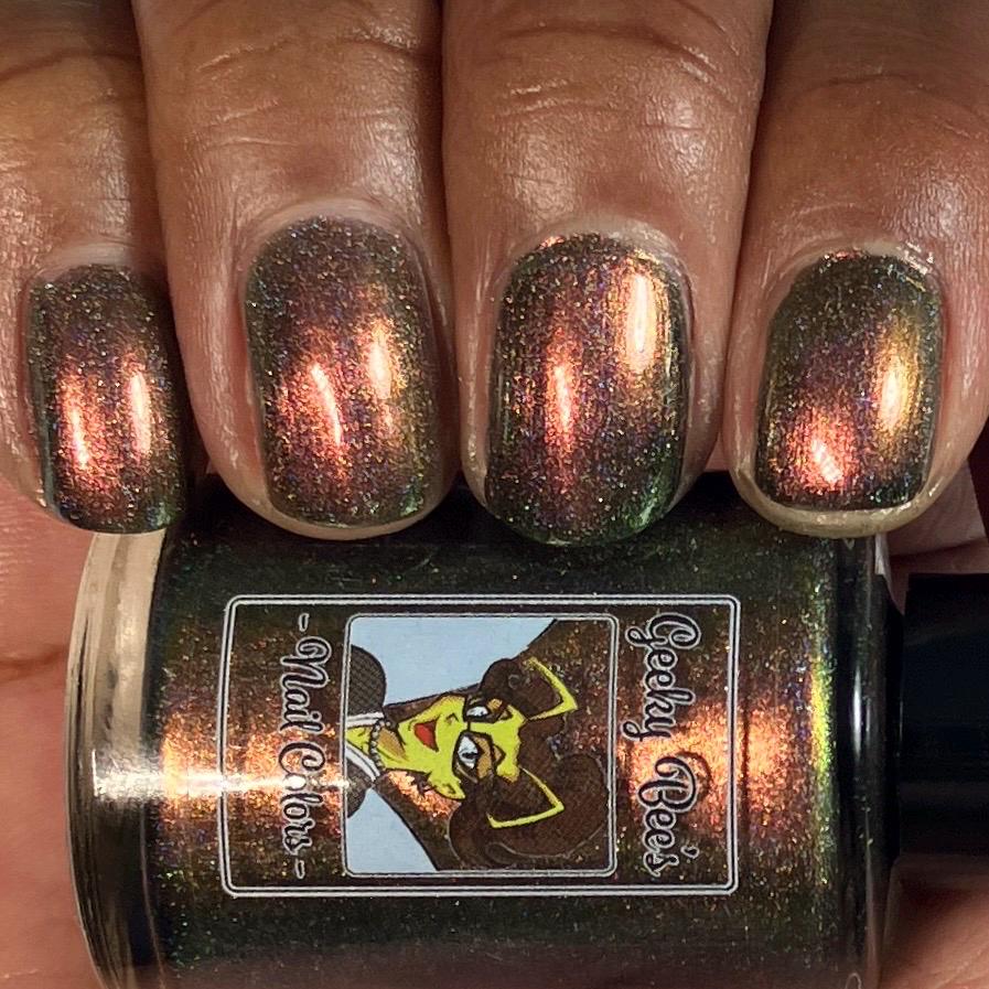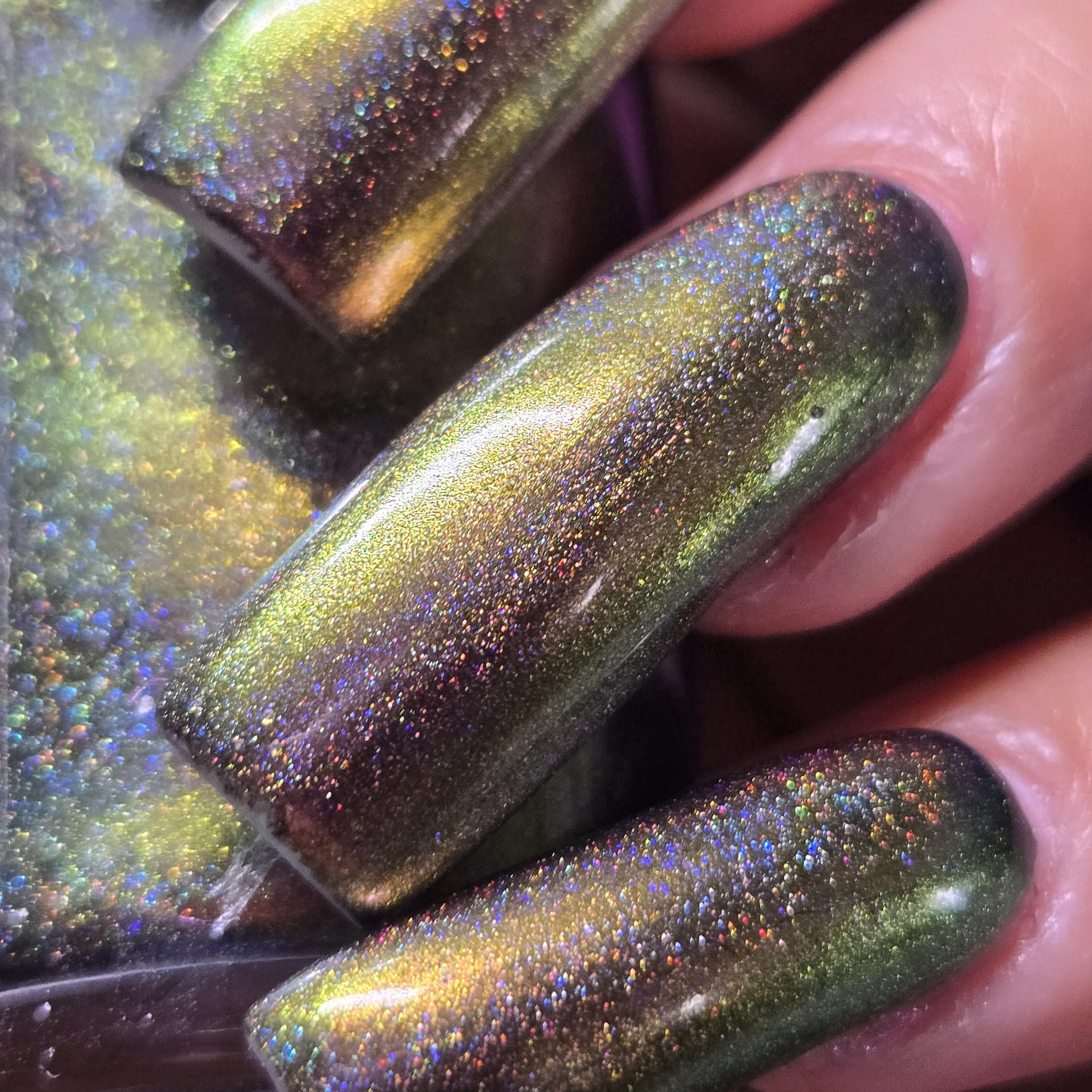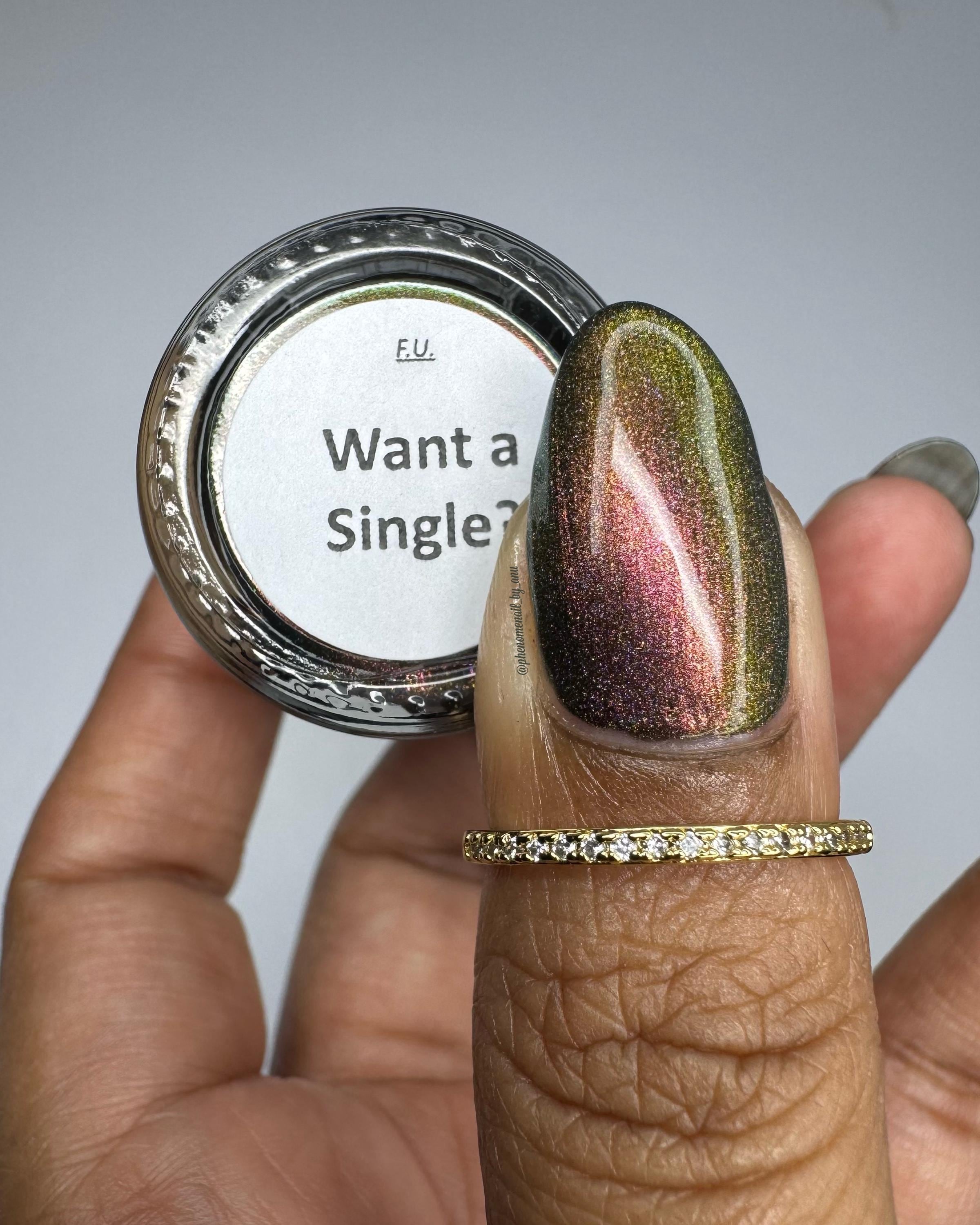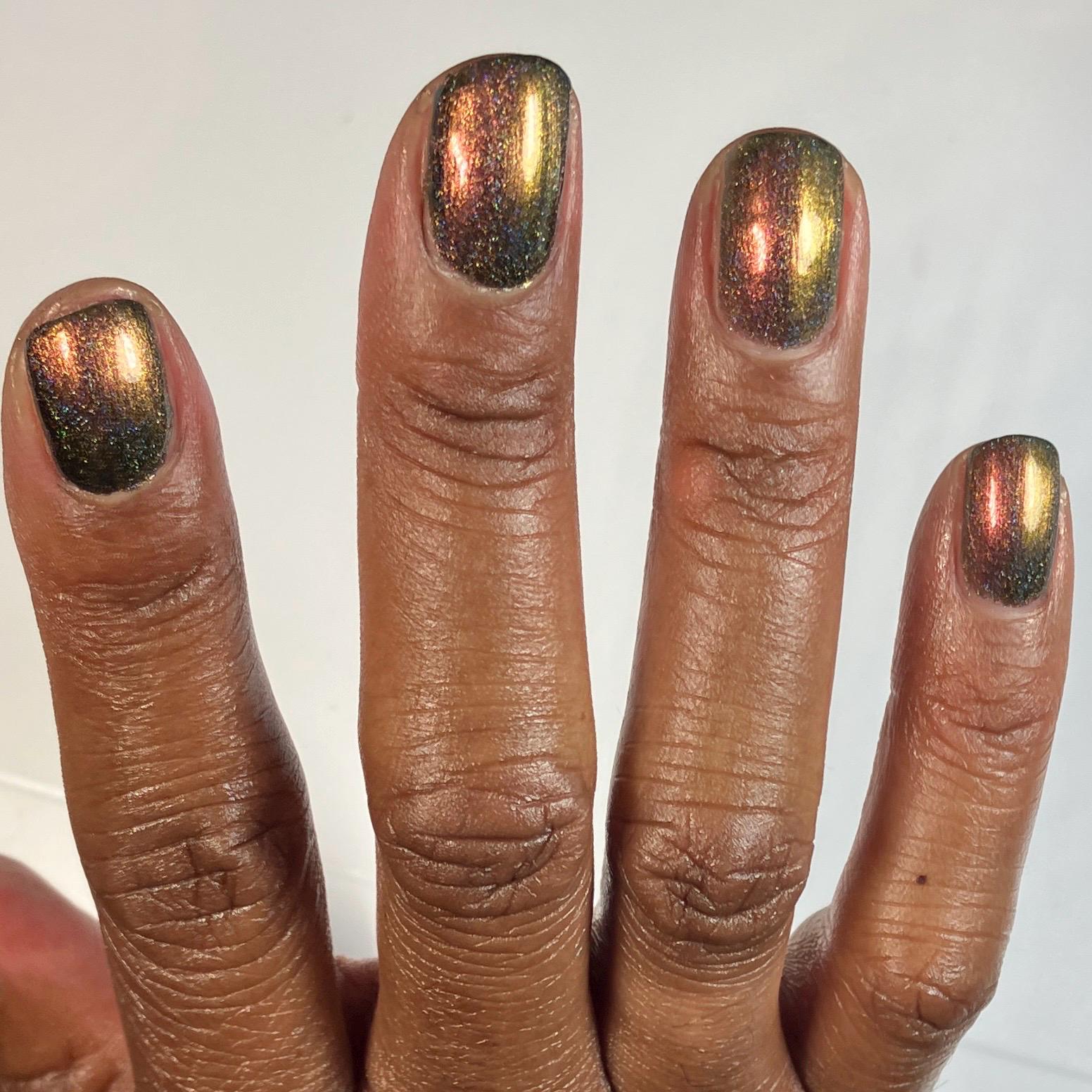 “Want a Single?” is a super shifty rose/green/gold/copper multichrome with a strong linear holo effect.