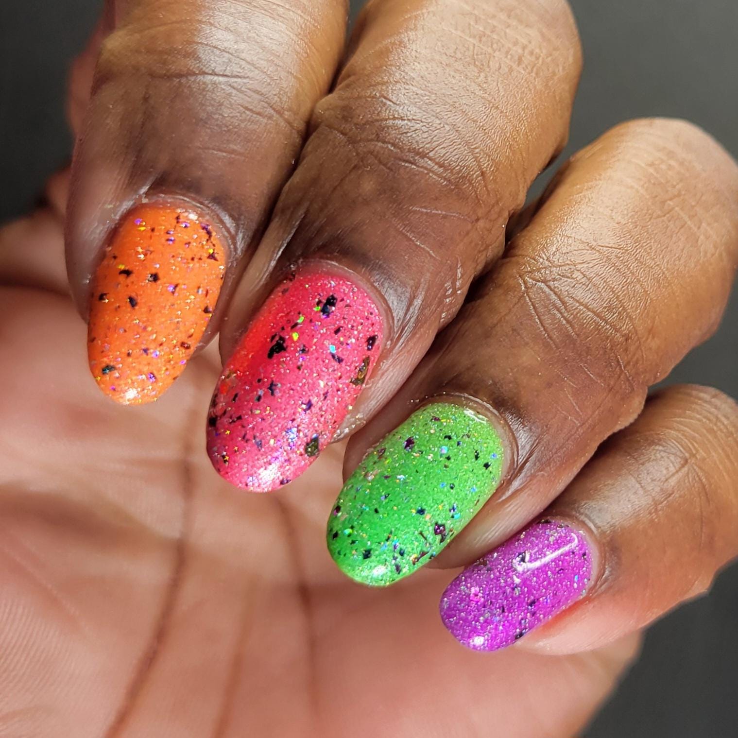 It Is Not. We Are.: a bright fiery neon orange sparkly shimmer.