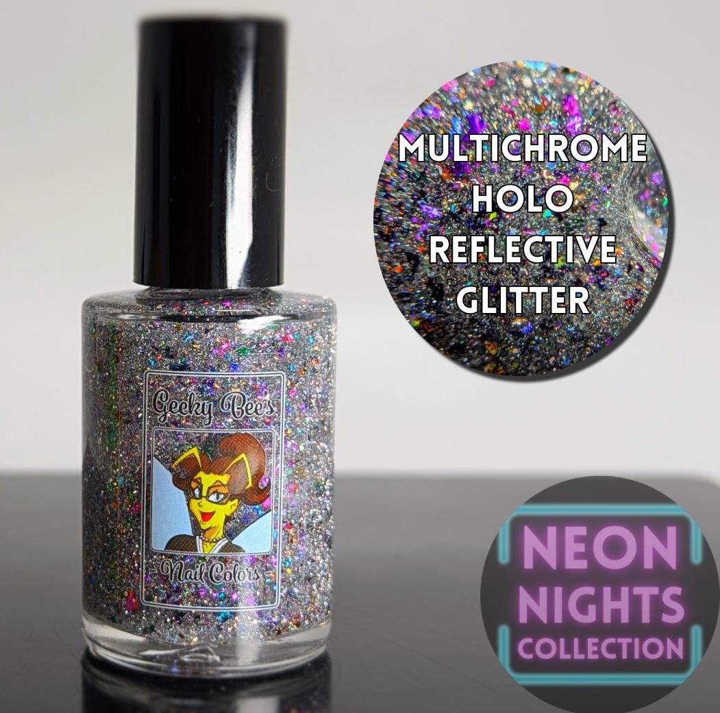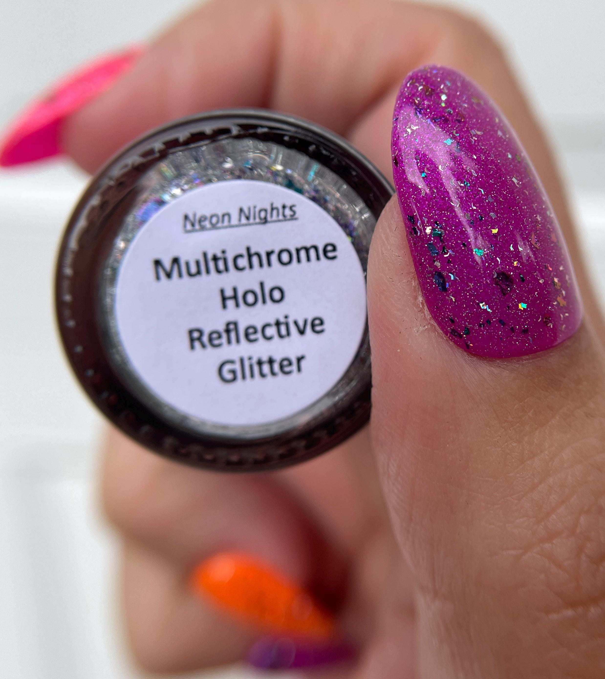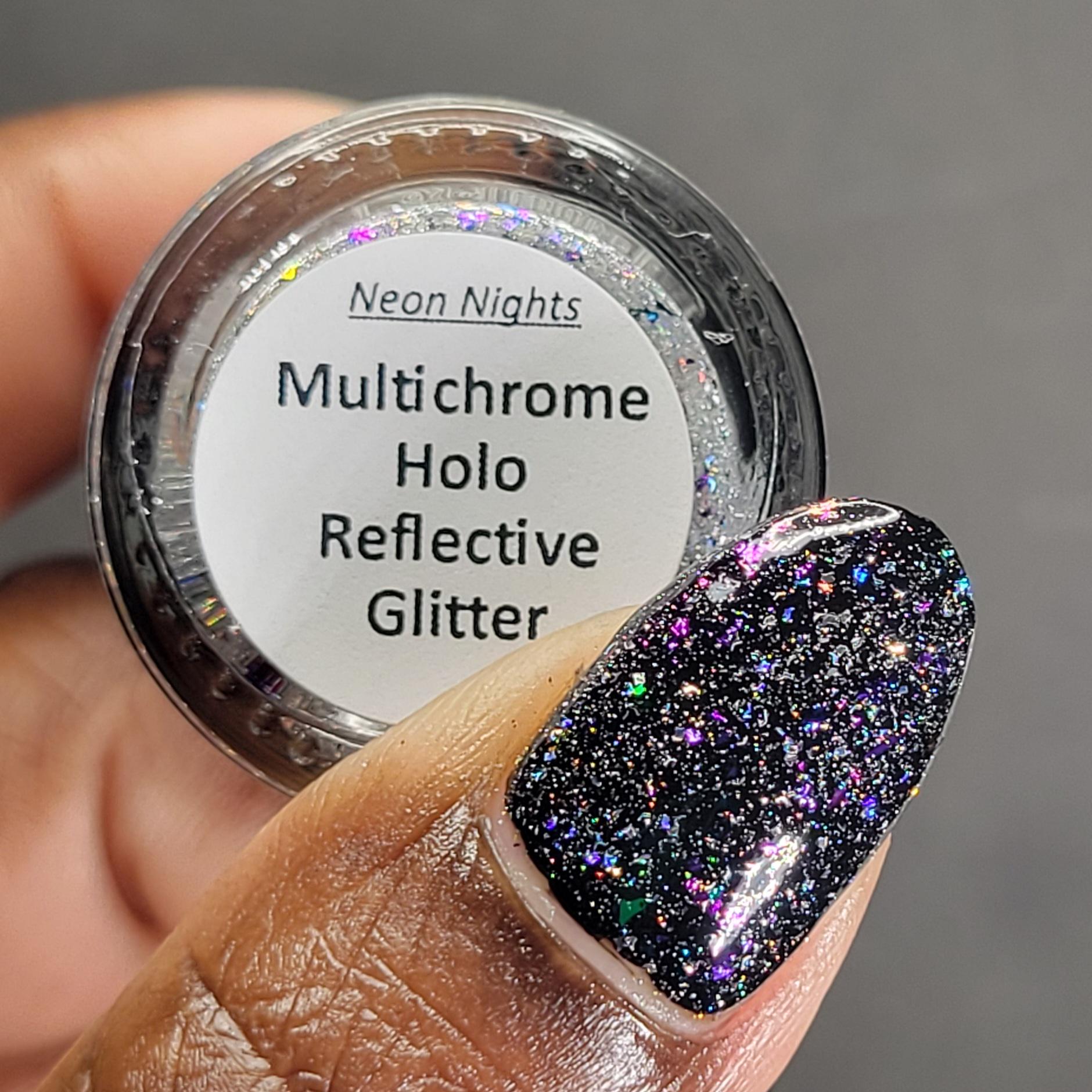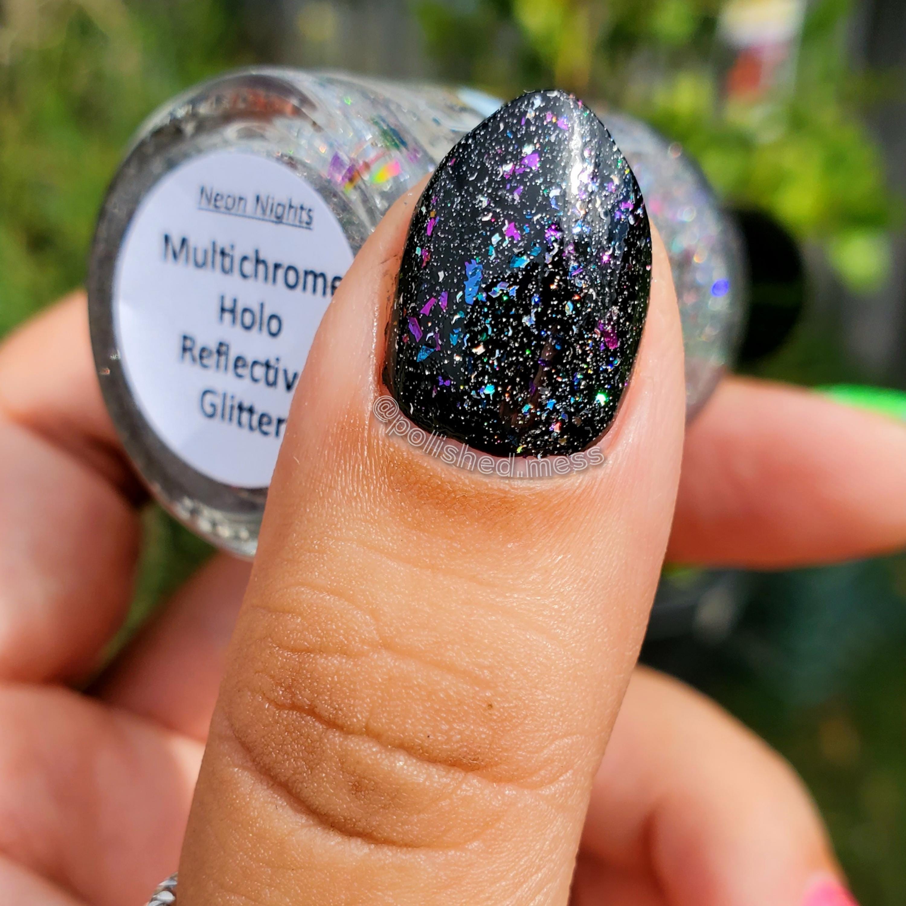 "Multichrome Holo Reflective Glitter" is a shimmery sparkly topper full of multichrome flakes, scattered holo, and, you guessed it, reflective glitter.