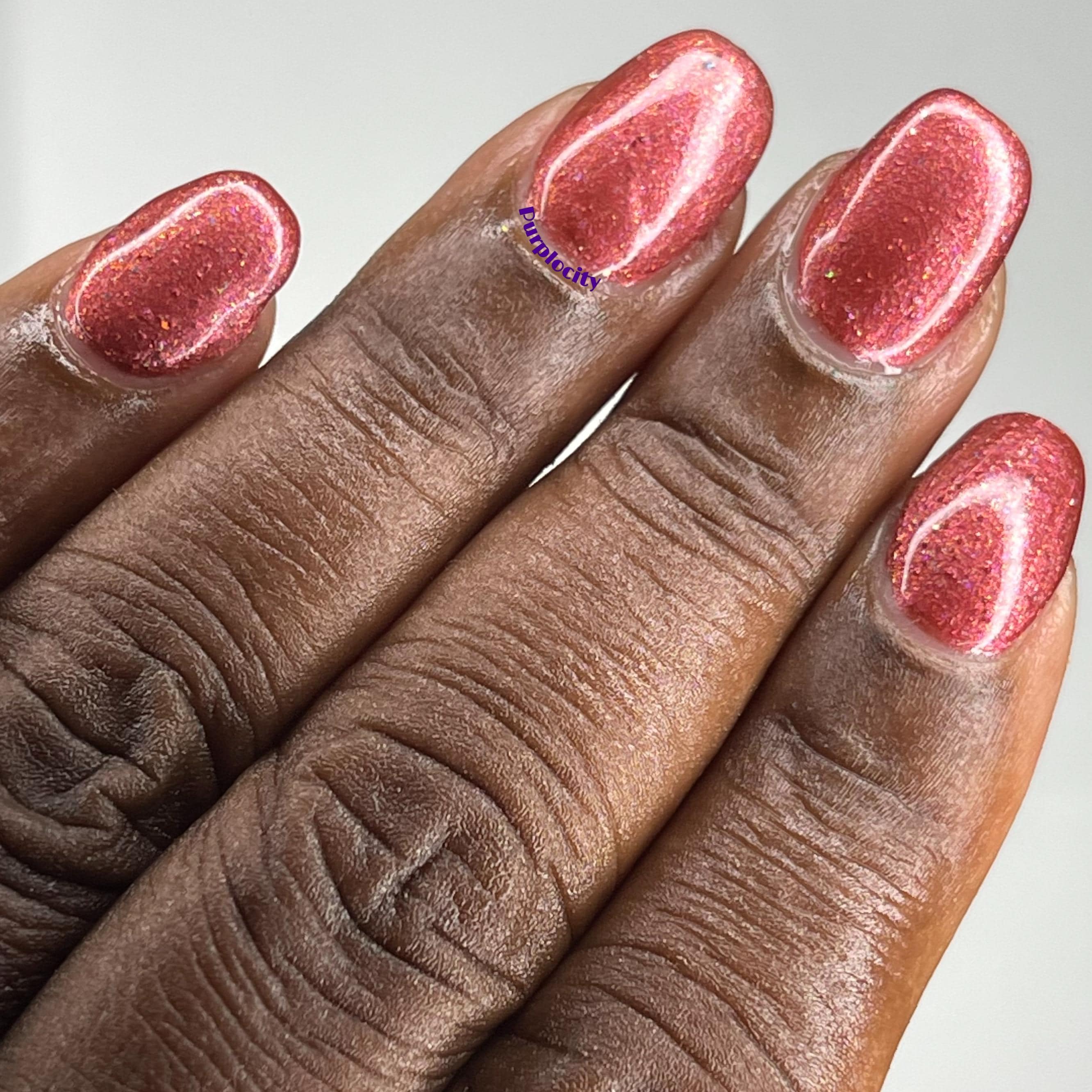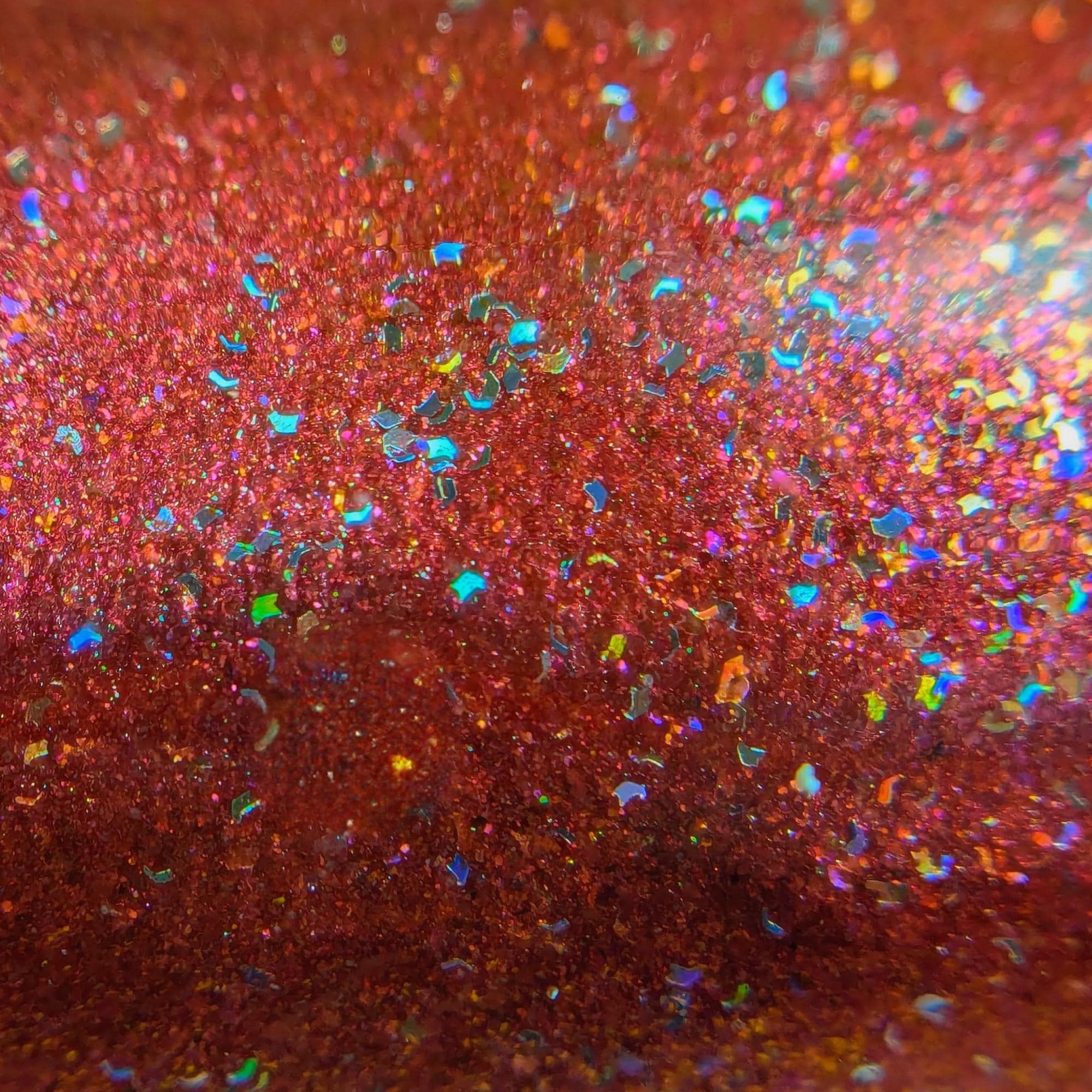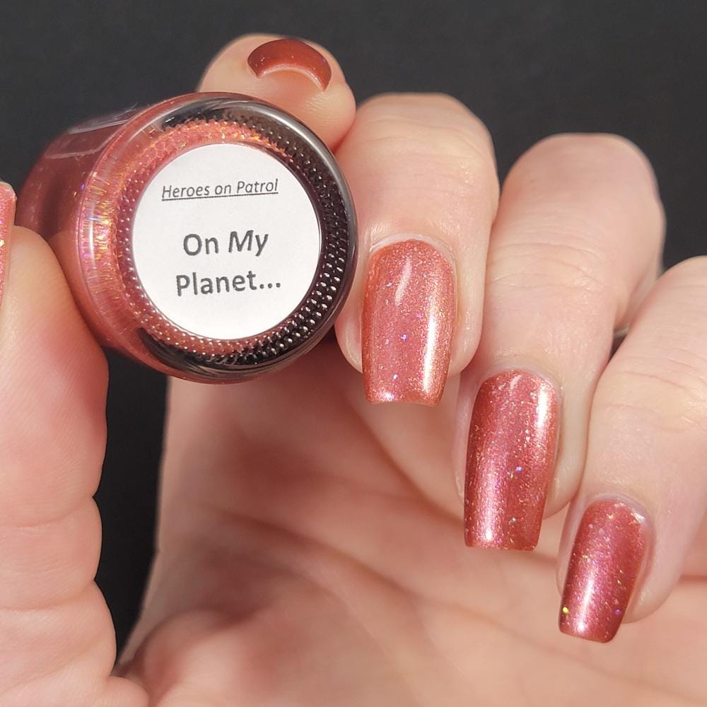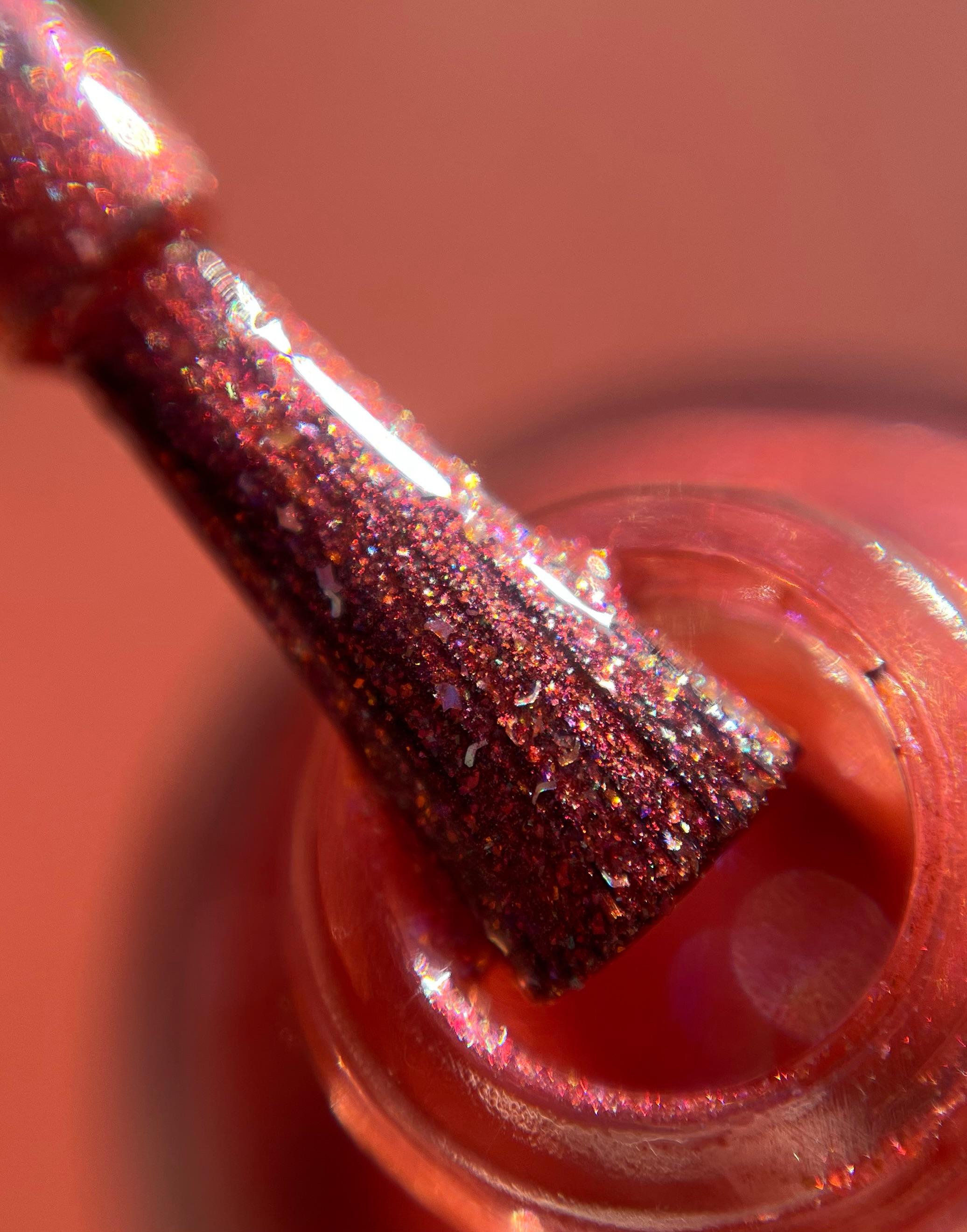On My Planet - a pinkish mid burgundy base full of orange sparkle, micro purple flakies, and holographic micro shredded glitter.