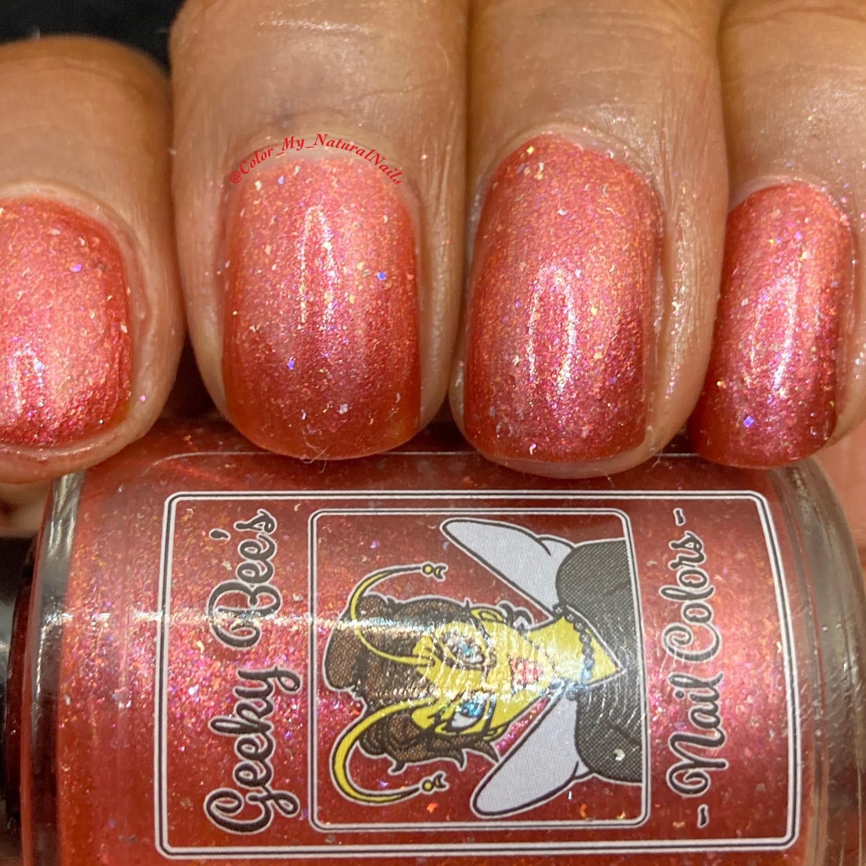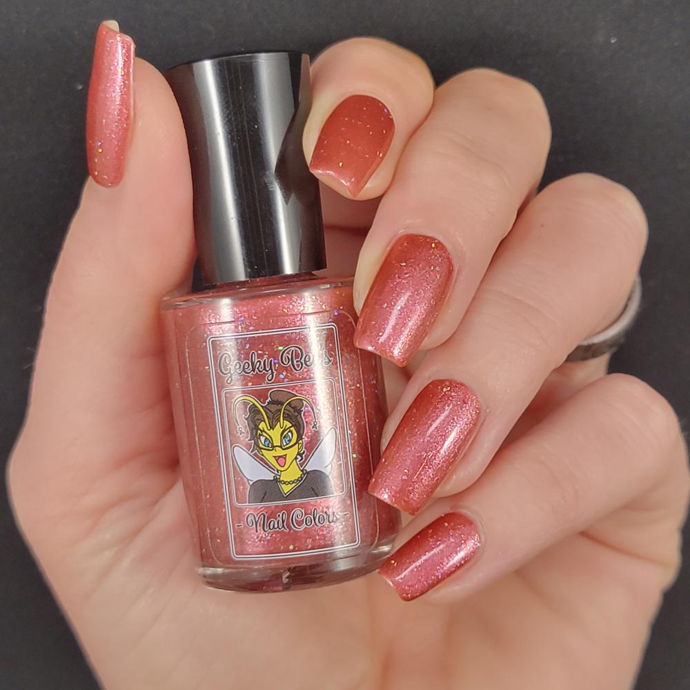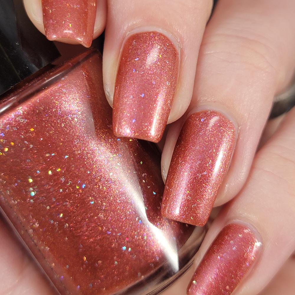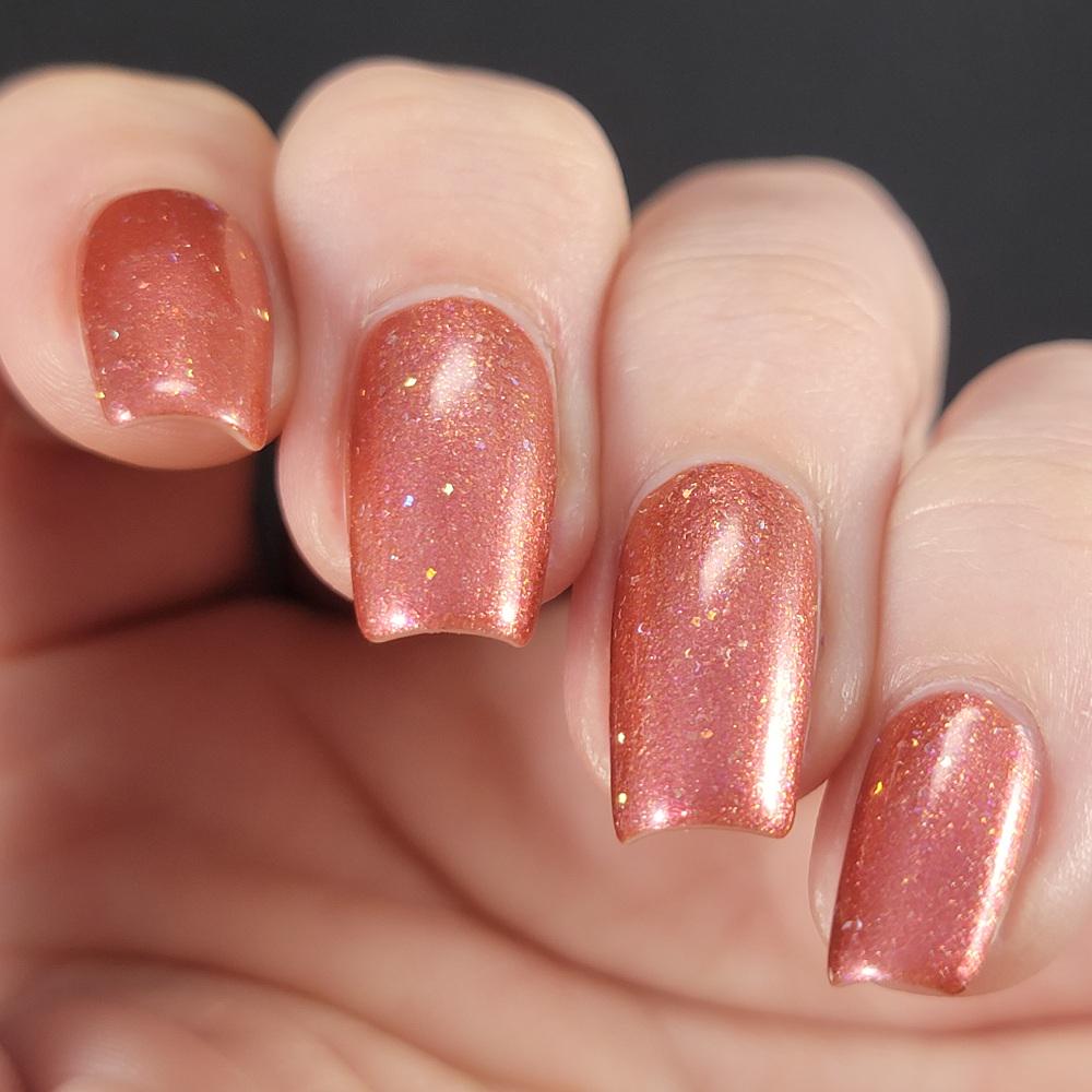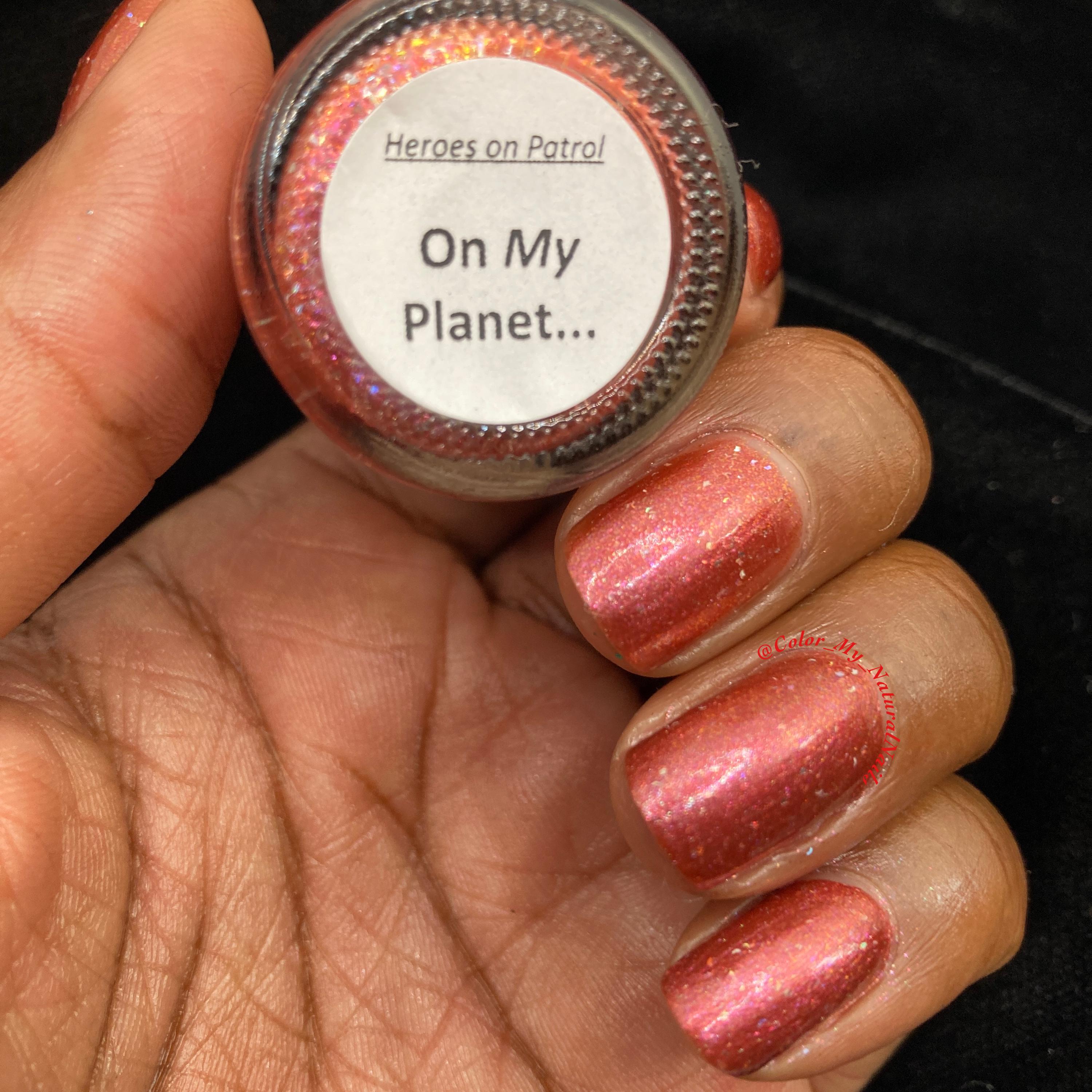 On My Planet - a pinkish mid burgundy base full of orange sparkle, micro purple flakies, and holographic micro shredded glitter.