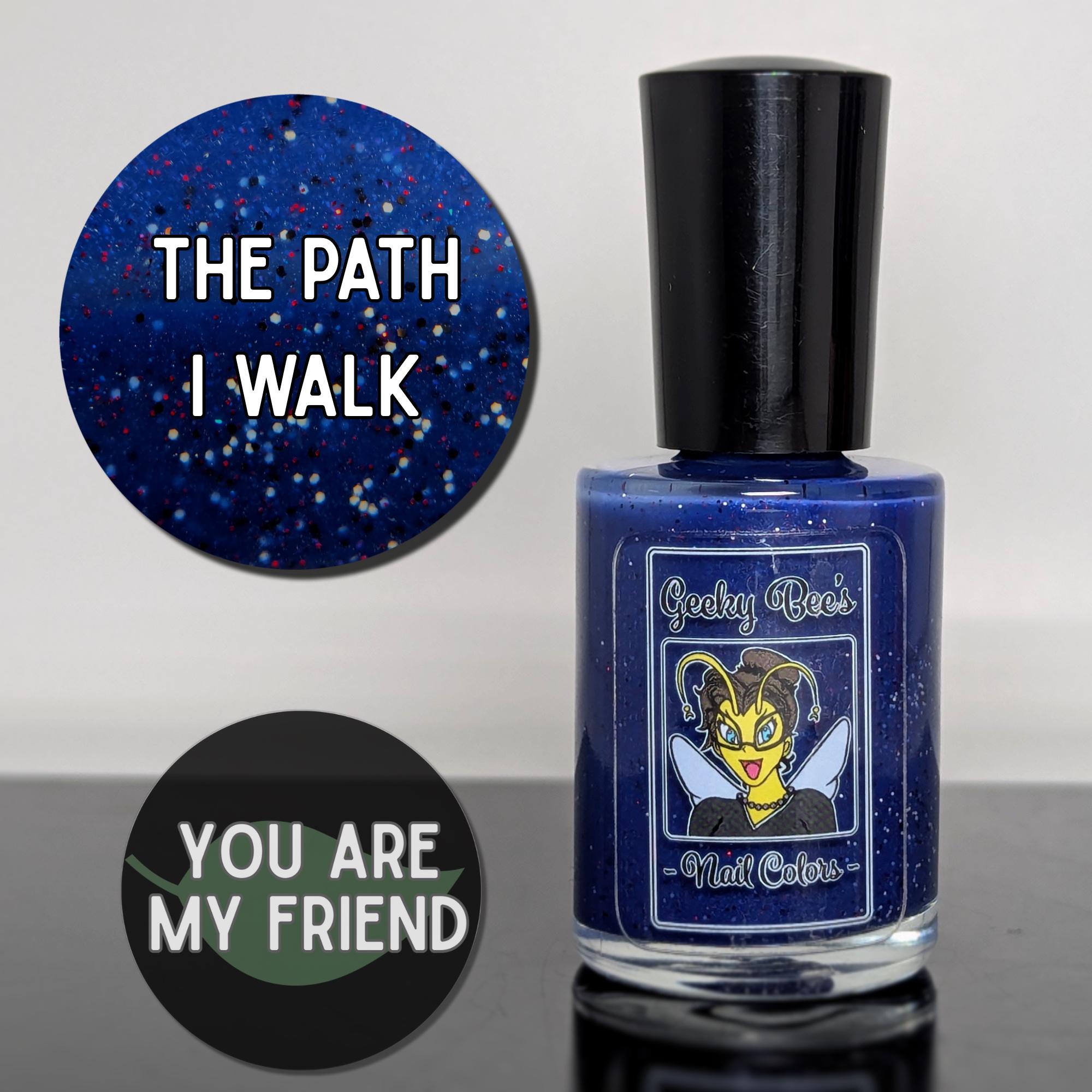 The Path I Walk is a deep blue crelly base with subtle blue sparkle, black and white glitter, and red micro glitter.