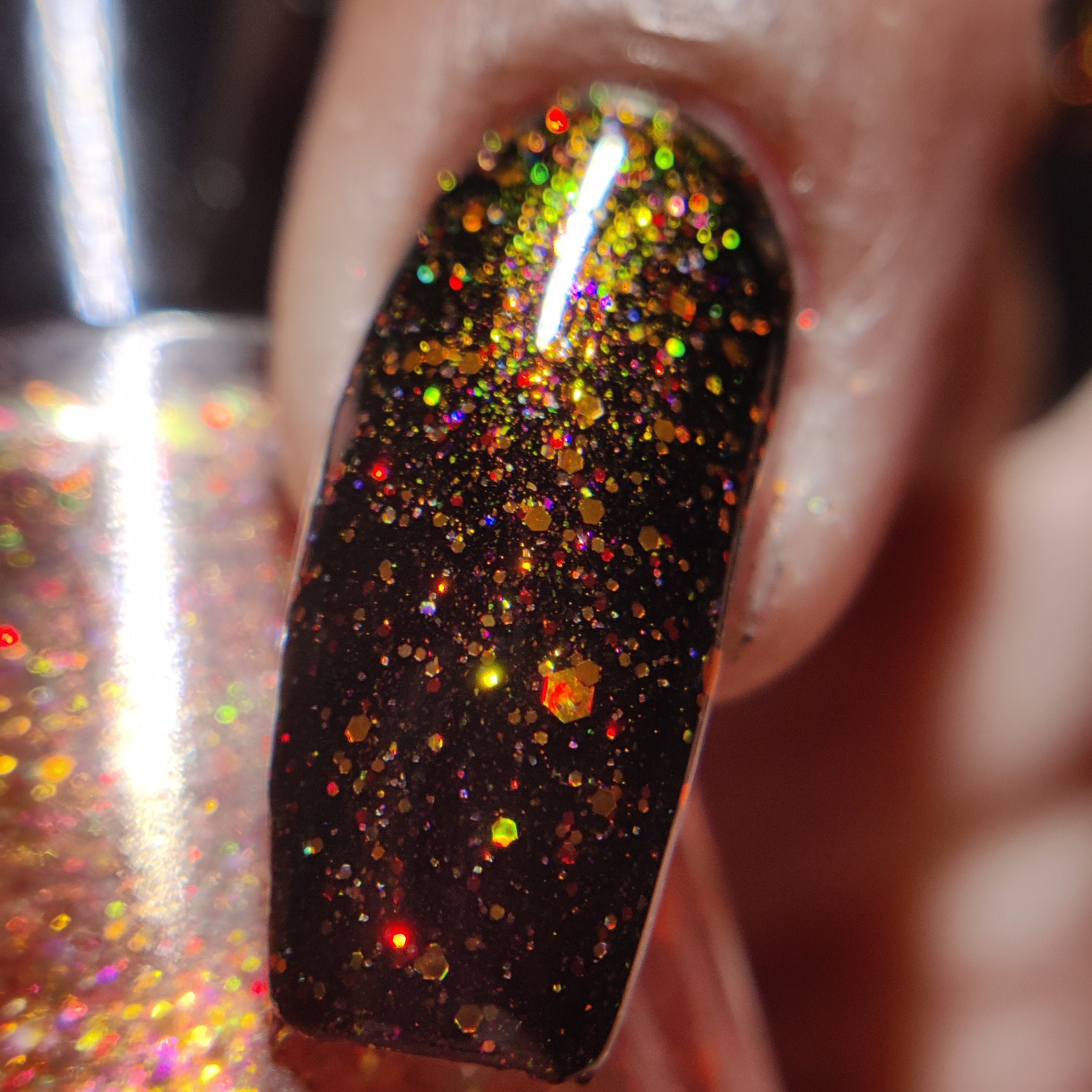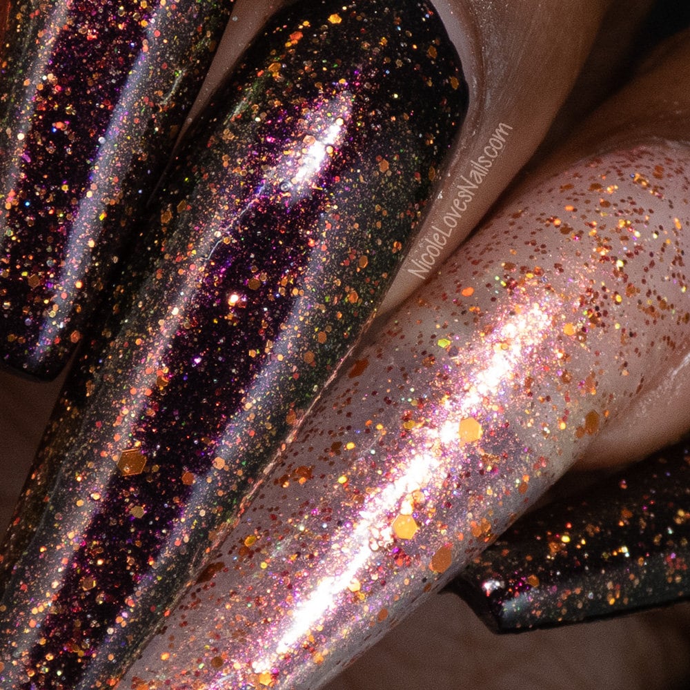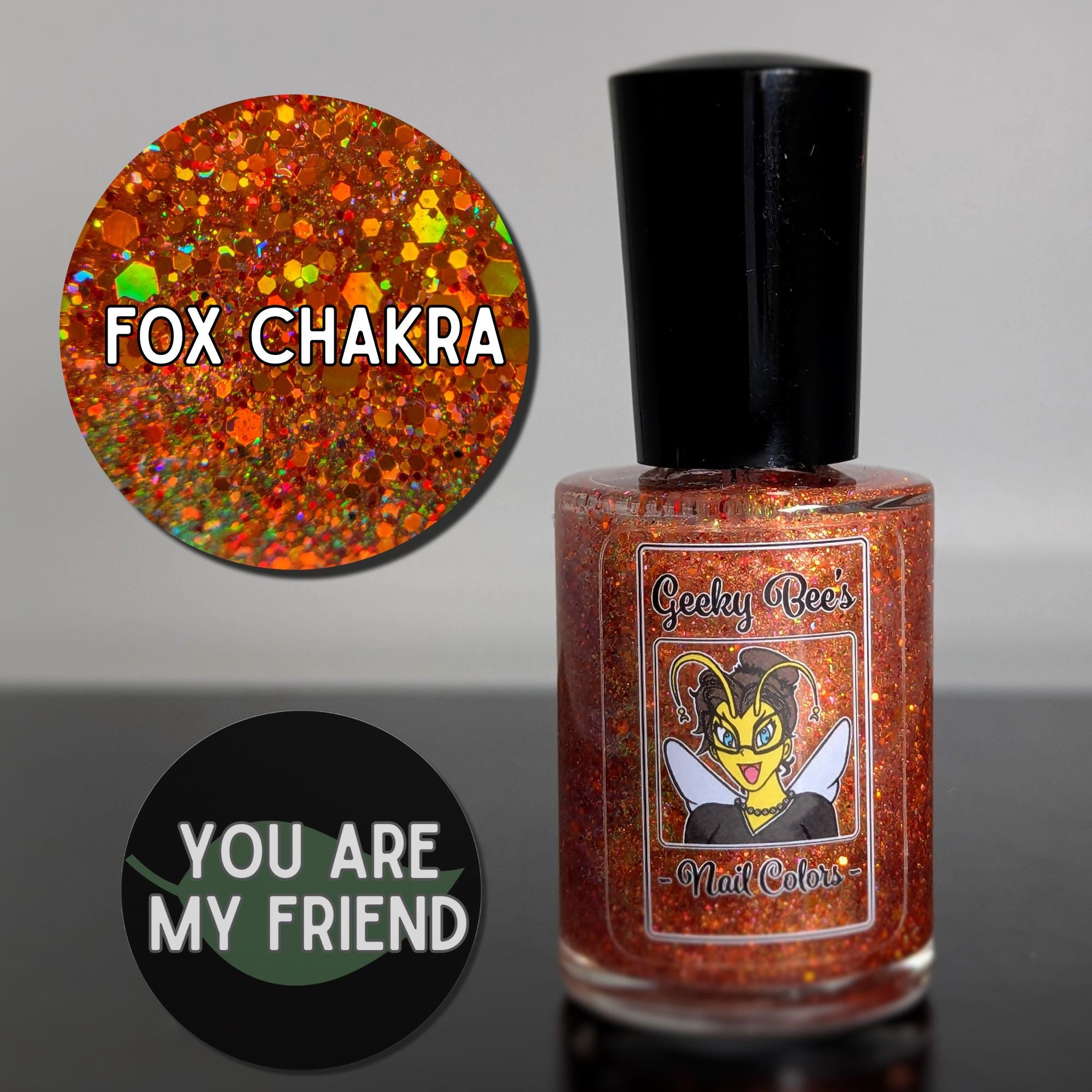 Fox Chakra is a glitter bomb full of aurora shimmer and loads of different sized orange and red glitter. Can be worn as a topper or on its own in 2-3 coats. Pairs beautifully with You Will Acknowledge Me. (**This polish has a SHEER base**)