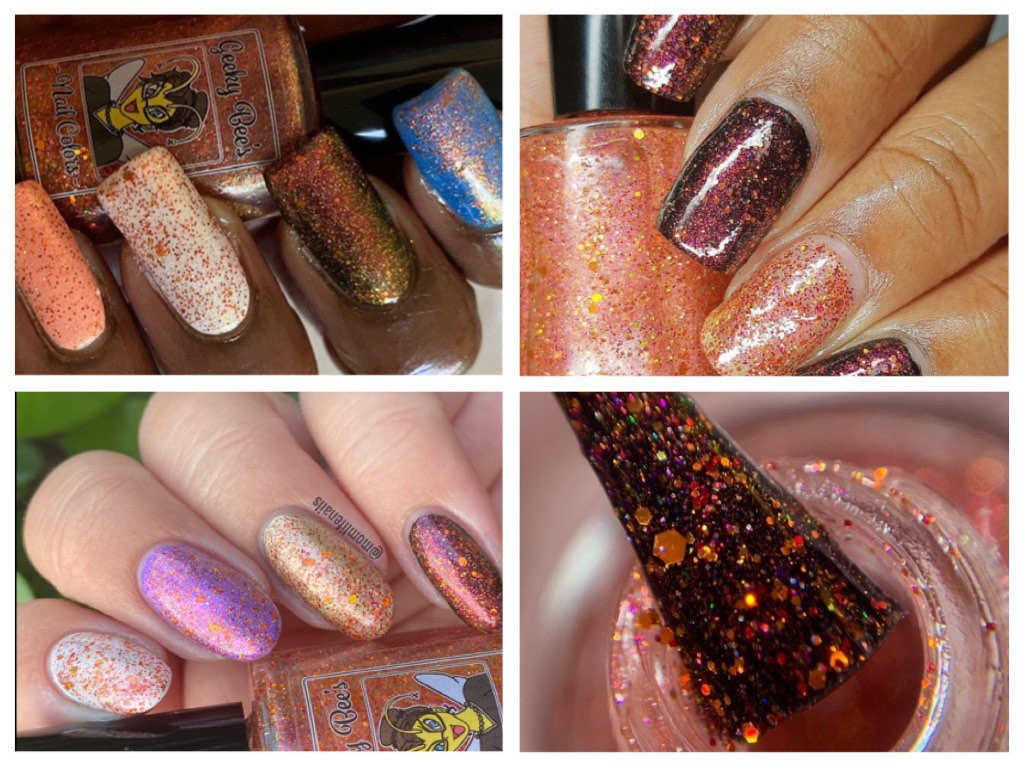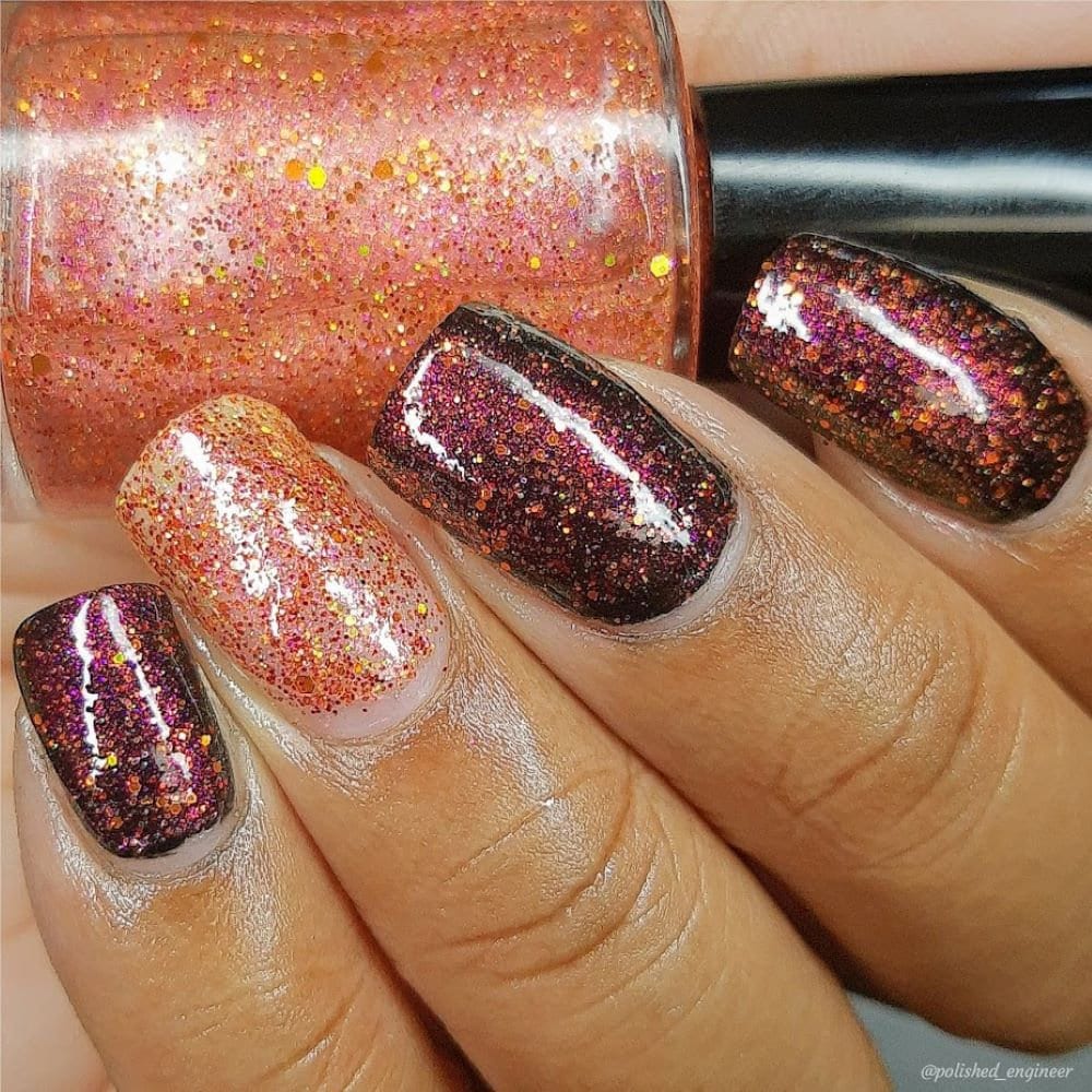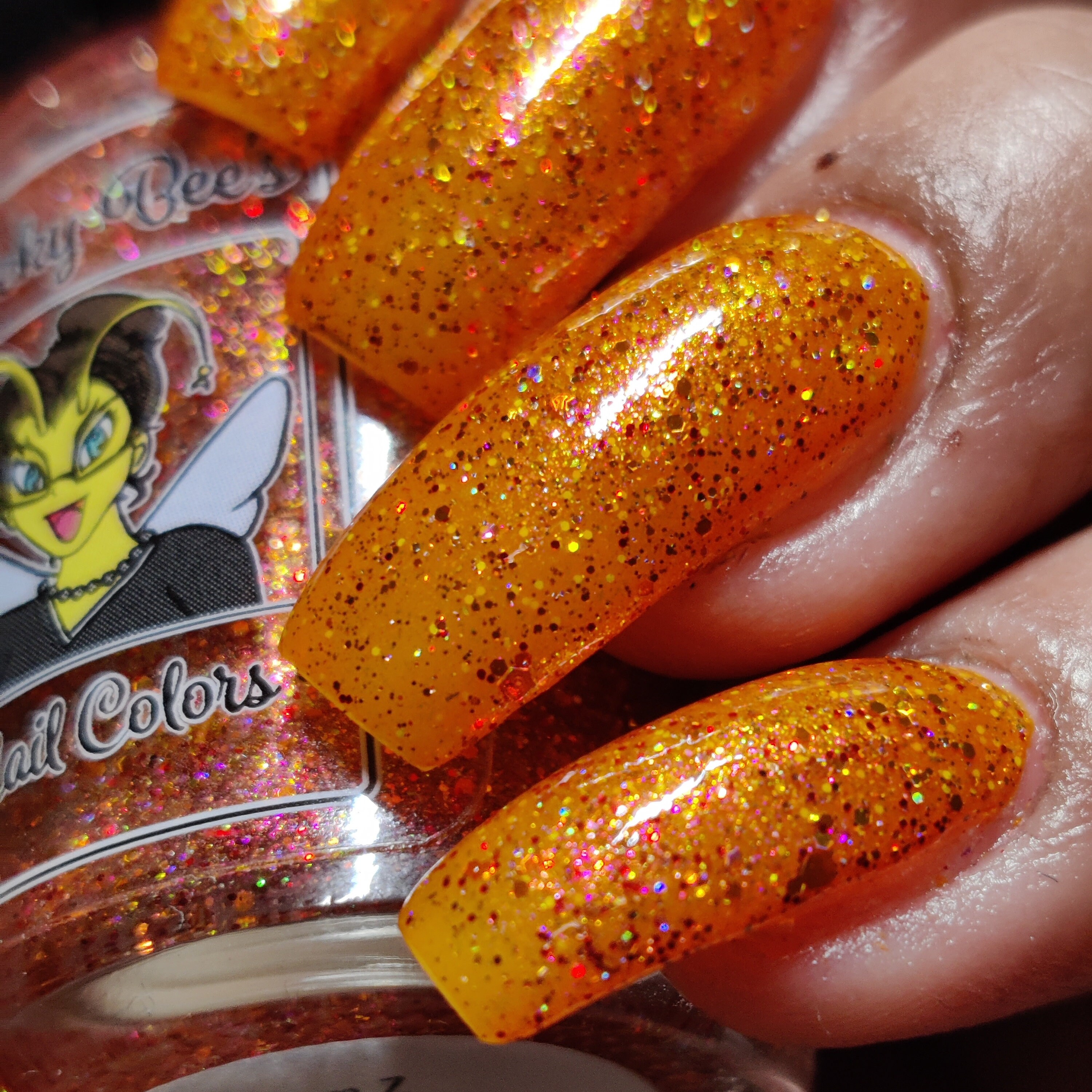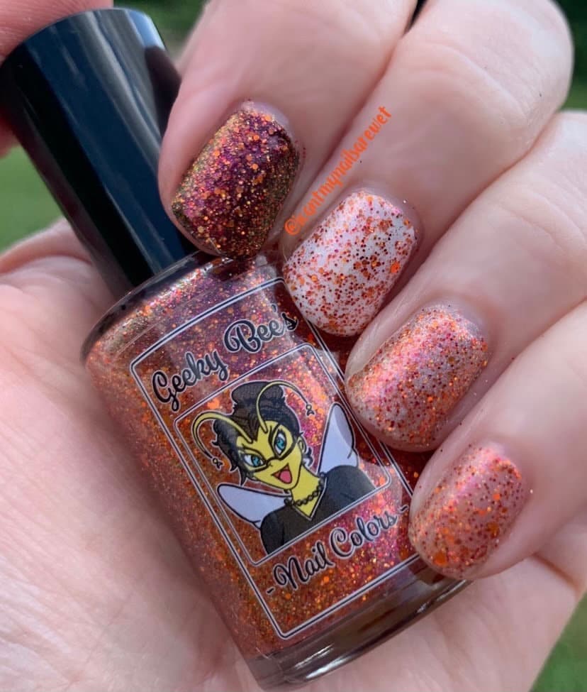 Fox Chakra is a glitter bomb full of aurora shimmer and loads of different sized orange and red glitter. Can be worn as a topper or on its own in 2-3 coats. Pairs beautifully with You Will Acknowledge Me. (**This polish has a SHEER base**)